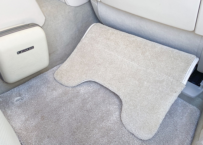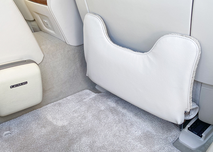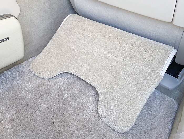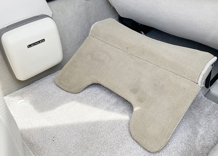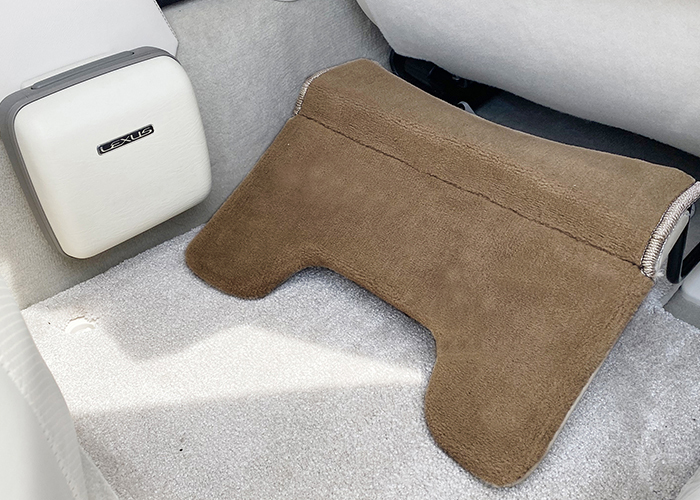 LS600hL エグゼクティブには左後席に電動オットマンが装着されていますが、使用性や快適性が本当に良いのかと自身では疑問に思っていて、むしろ30系セルシオでオプション設定のあったオットマンの方が、使用性及び快適性が良いのではと考えておりました。加えて快適装備が左後ろのみというのもあまり好きではなく、右後席にお乗りになられる方にも快適に車内で過ごしていただけるように、自分なりの後席快適を求め30セルシオ用のオットマンの表皮を専門業者さんに張り替えていただき、車両取り付けに必要な自作ブラケットを作成し、後席快適装備の充実をおこないました。