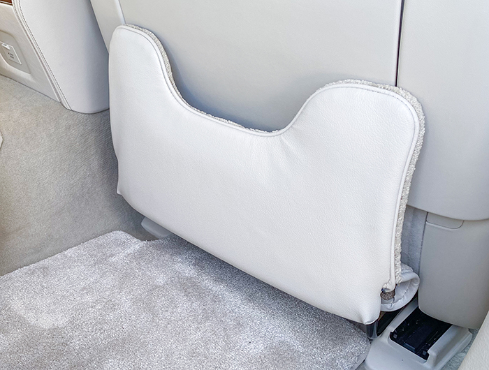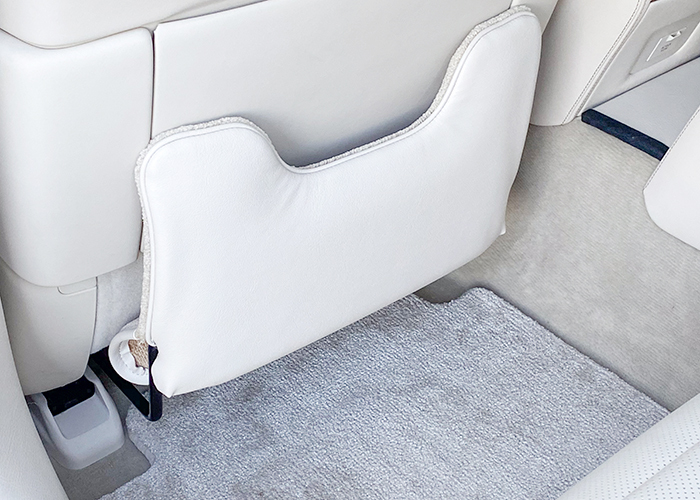 ゴミ箱が装着されていますが、干渉しないように位置調整を行ったので、使用状態で運転席を後ろにスライドさせても干渉することはありません。こちらは電動オットマンも装着されていない側なので、装着の満足度は非常に高いです。