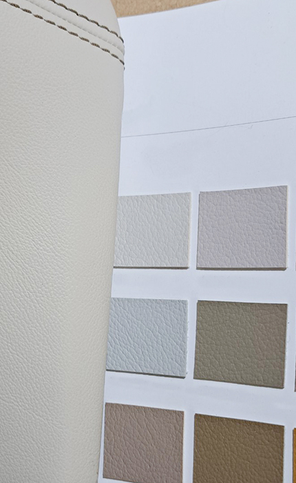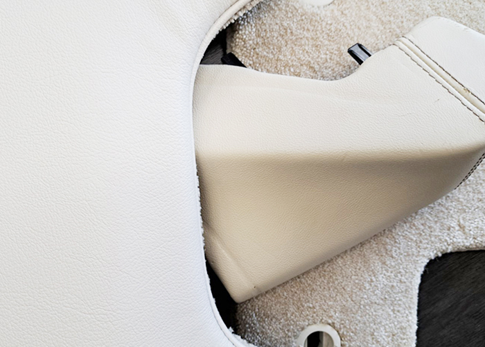 一番理想とする仕上がりの色味、ただメローホワイトに近い色味の素材があるのか、または着色で再現できるのかが心配、表面は擬似レザーを用いて汚れた時のメンテナンス性をよくする。裏面は近似色カーペットを用いてカラーコーティネートを行い自然な設置感を目指す。