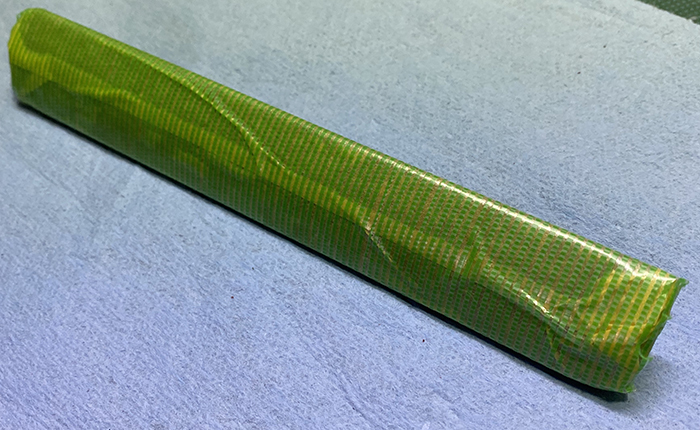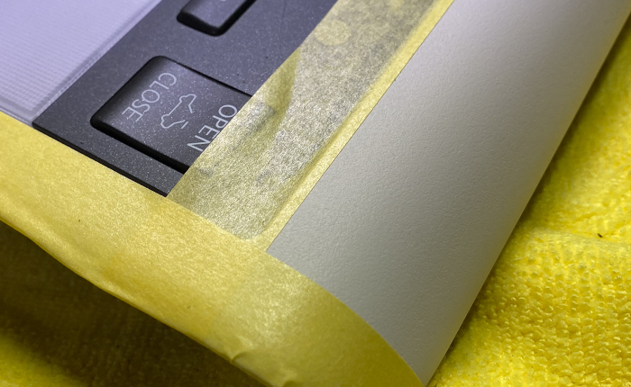 養生は粘着力の弱いマスキングテープを先に貼り、養生テープ(グリーン)をはります。先にマスキングテープを貼ったのは、養生テープをウッドに直貼りすると粘着力が強いので、薄くなったウッドが粘着力に負けて折れたり、クリア部分がかけたりする可能性がある為です。