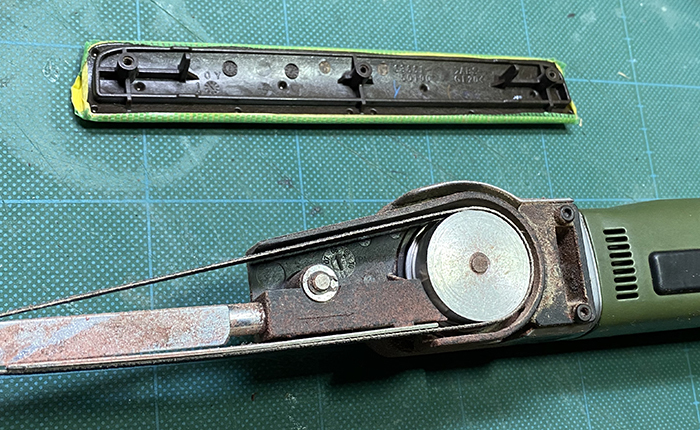 樹脂部分をザックリと削って行くのは、電動マイクロベルトサンダーです。