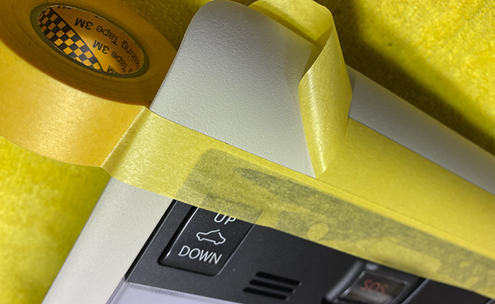 ウッドと黒のスイッチベースの隙間(基準線)を確認する為にマスキング。