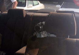 助手席の枕を少し上げて固定されています。振動亡しにタオルを敷くのがニクイですね~。