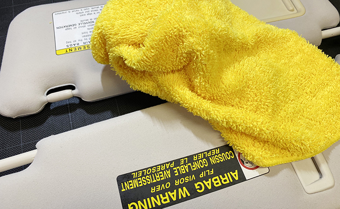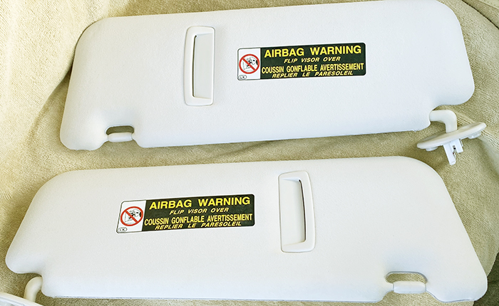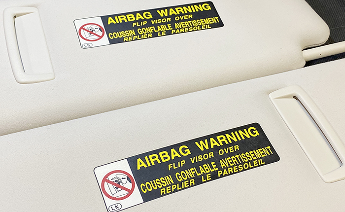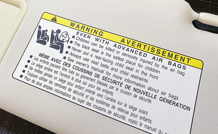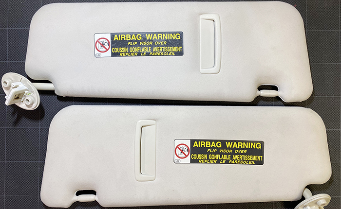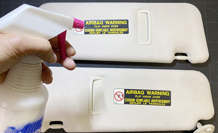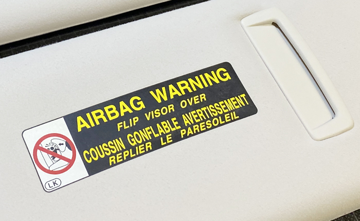 US仕様にする訳ではありませんが、きっと読むことないサンバイザーの注意書き、それなら雰囲気重視でデザインのカッコいいUS仕様にしたいと考え、部品交換を行いました。メローホワイト内装に黒のコーションラベルが目立ってカッコいい!!