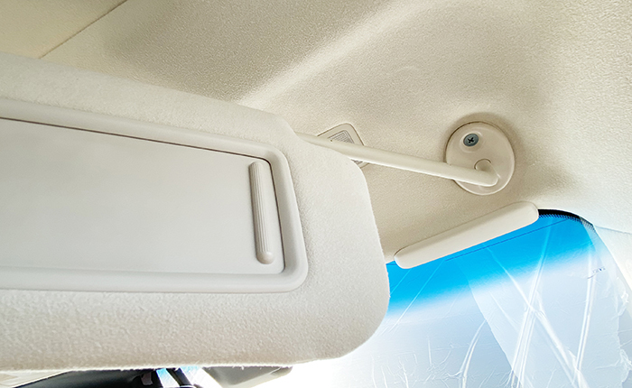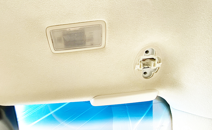 サンバイザーを引き出し、ネジを固定しているカバーを取り外しプラスネジ2本を緩めます。
